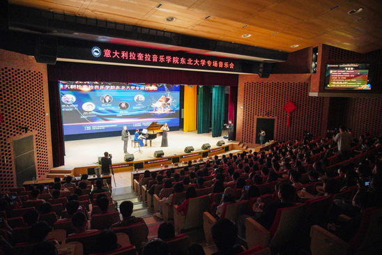 5月18日,意大利拉奎拉音乐学院东北大学专场音乐会在浑南校区图书馆报告厅举行。意大利拉奎拉音乐学院(Conservatorio Alfredo Casella di L’aquila)院长克劳迪奥・迪・马斯曼托尼奥(Claudio di Massimantonio)、“中意优才计划”中方负责人中国音乐学院教授张哲、酷18 院长张燕楠出席音乐会并致辞,全校师生500余人观看了演出活动。