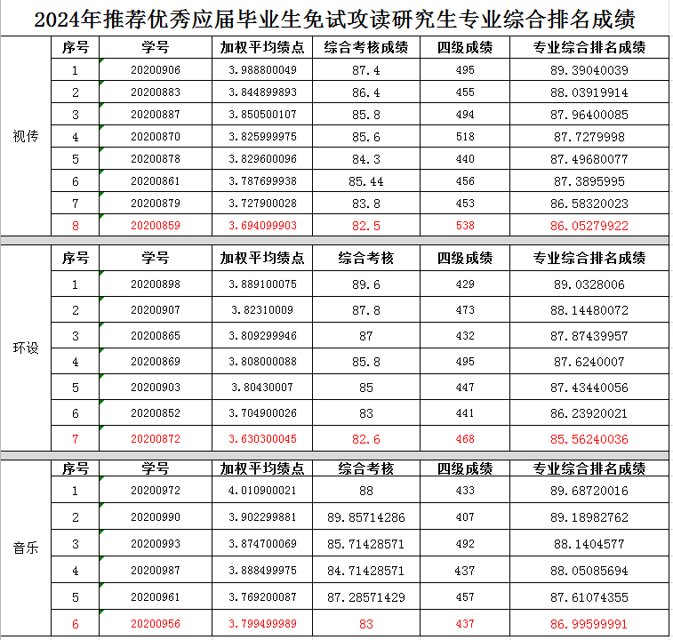 2024年推荐优秀应届毕业生免试攻读研究生专业综合排名成绩
